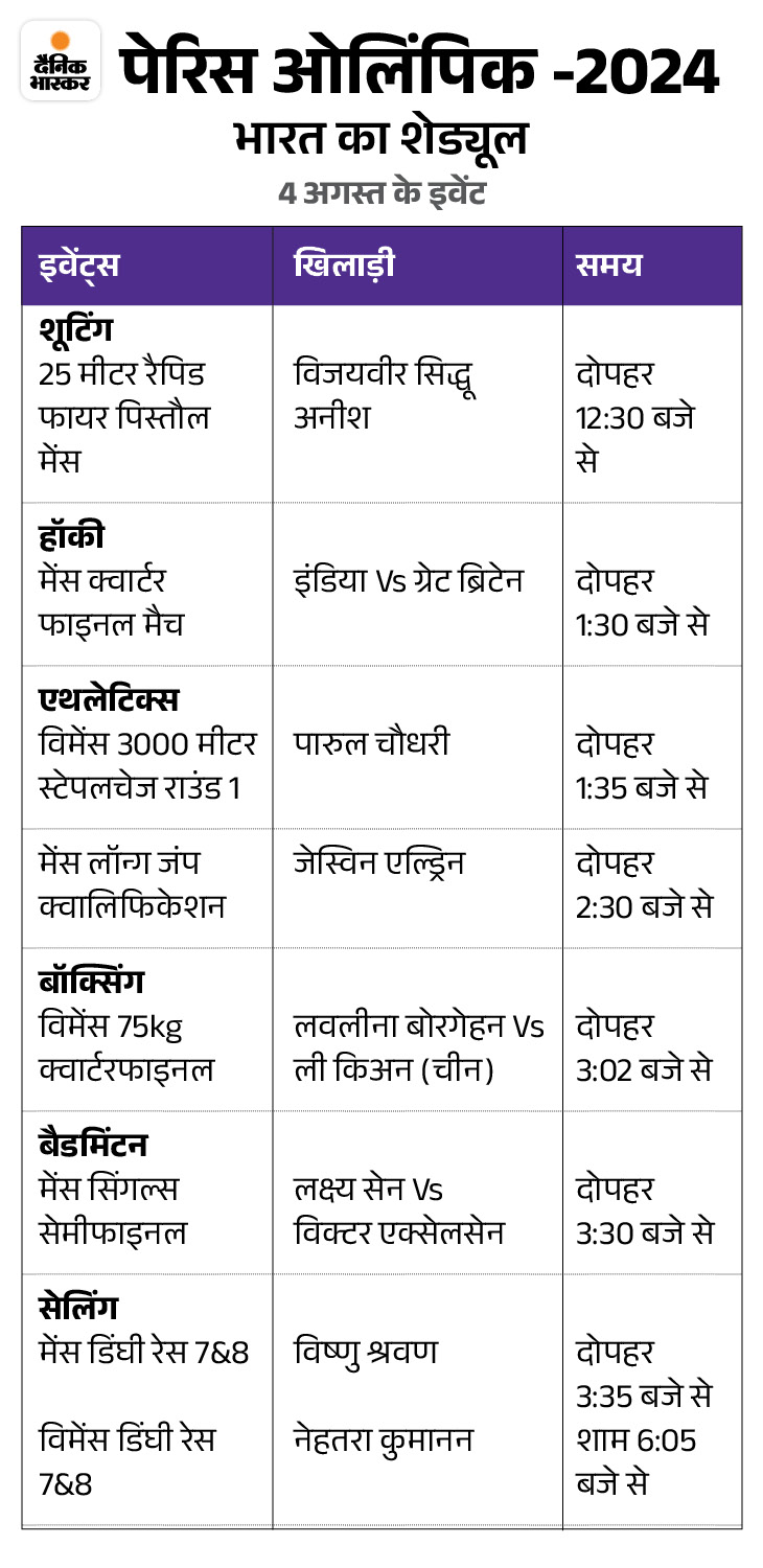 पेरिस ओलंपिक में भारत ने अब तक 3 पदक जीते हैं. ये सभी मेडल शूटिंग में आए हैं. ओलंपिक खेलों के इतिहास में यह पहली बार है कि भारत ने निशानेबाजी में 3 पदक जीते हैं. अब 4 अगस्त को भारतीय खिलाड़ी बॉक्सिंग, बैडमिंटन, शूटिंग, हॉकी, सेलिंग और एथलेटिक्स खेलते नजर आएंगे.