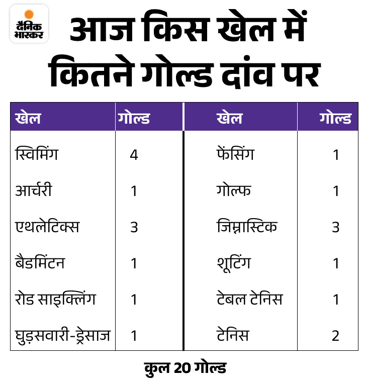 पेरिस ओलंपिक खेलों के नौवें दिन कुल 20 स्वर्ण पदक दांव पर होंगे। भारत कल अपने 2 पदक पक्के करना चाहेगा.