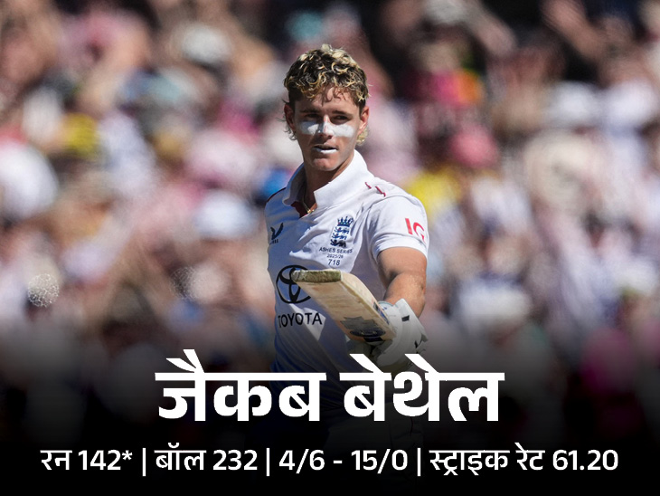 इंग्लैंड के लिए दूसरी पारी में जैकब बेथेल ने नाबाद 142 रन बनाए. यह बेथेल के ट्रायल रन का पहला शतक है।