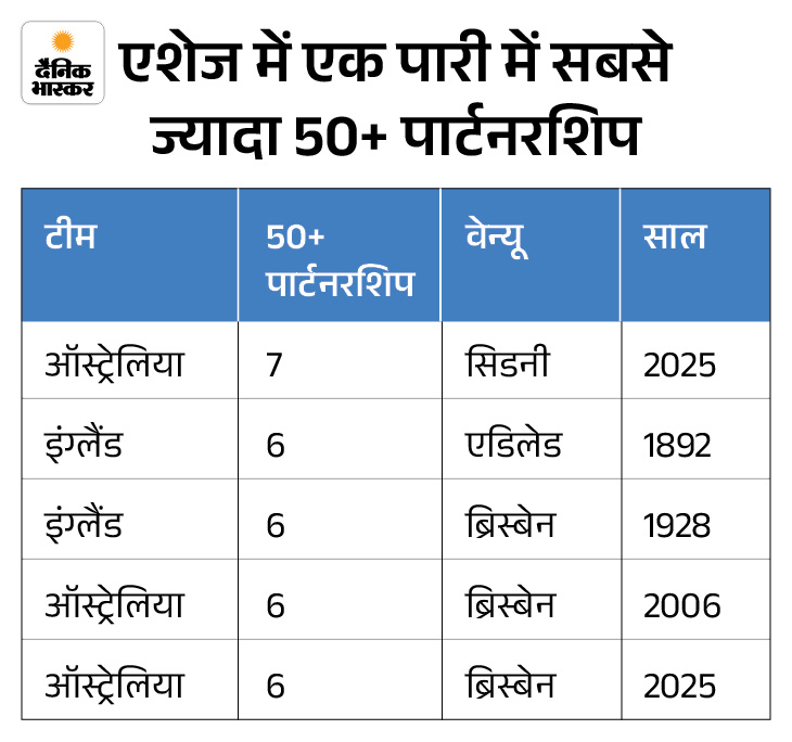 ऑस्ट्रेलिया की पहली पारी के दौरान सात बार 50 से अधिक की साझेदारियाँ हुईं, जो एशेज इतिहास में पहली बार था।