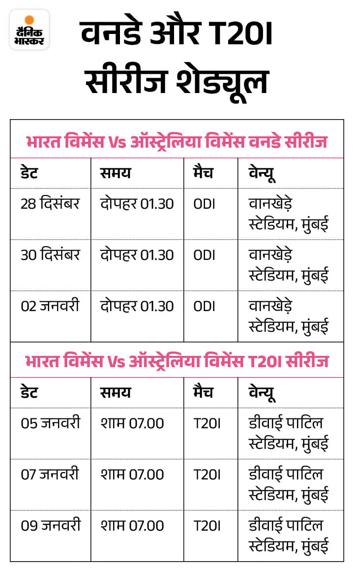 ऑस्ट्रेलिया के खिलाफ वनडे और टी-20 सीरीज के लिए भारतीय महिला टीम का ऐलान हो गया है। सायका इशाक, श्रेयंका पाटिल, मन्नत कश्यप और तितास साधु को पहली बार वनडे टीम में जगह मिली है. ऑस्ट्रेलिया के खिलाफ 3 वनडे और 3 टी20 मैचों की सीरीज 28 दिसंबर से मुंबई में शुरू होगी.