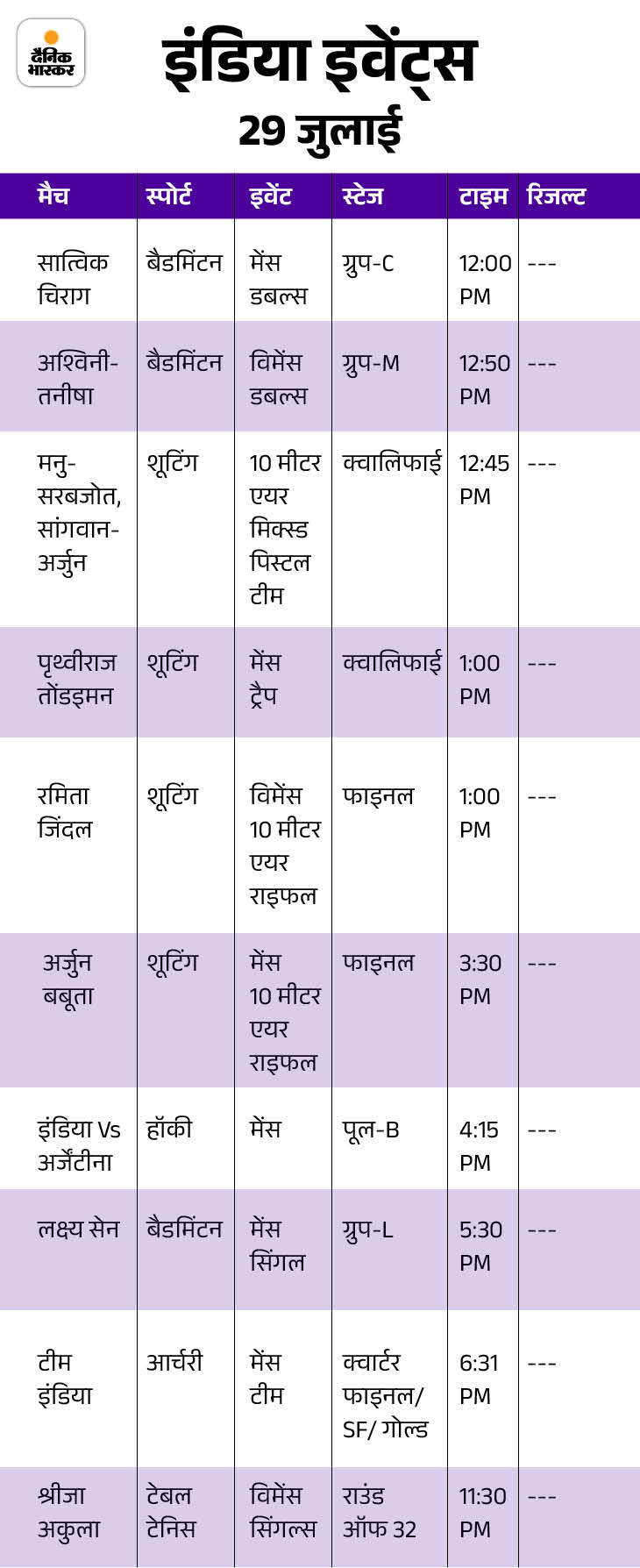 भारत के पास आज पदक जीतने के 3 मौके हैं. हमारे खिलाड़ी 2 पदक स्पर्धाओं में भाग लेंगे। महिलाओं की 10 मीटर एयर राइफल शूटिंग फाइनल में, रमिता दोपहर 1 बजे पदक के लिए उतरेंगी और अर्जुन बाबुता दोपहर 3:30 बजे पदक के लिए उतरेंगे।