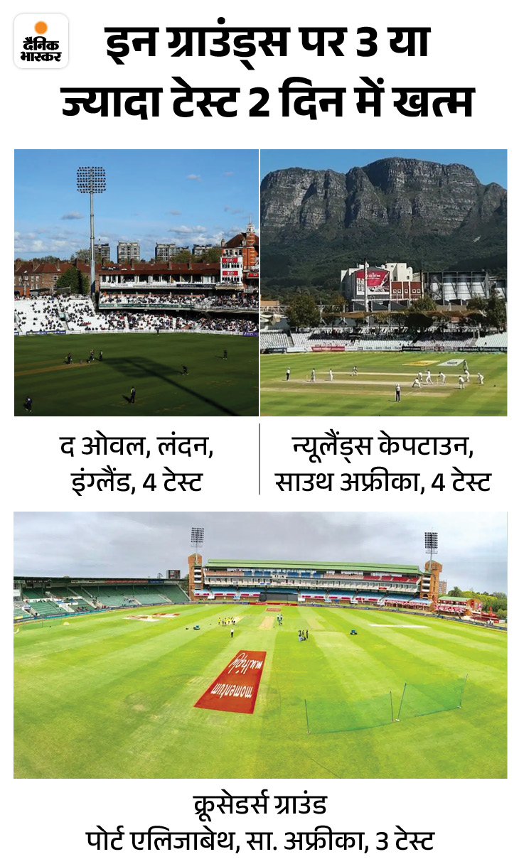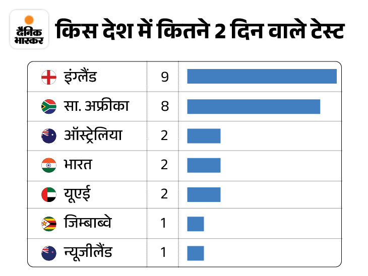 इंग्लैंड इनमें से 12 टेस्ट मैचों का हिस्सा रहा है. वहीं, ऑस्ट्रेलिया के 12 टेस्ट मैच दो दिन में खत्म हो गए। दक्षिण अफ्रीका ने 10 मैचों में भाग लिया। जिम्बाब्वे 4, वेस्टइंडीज 2 और पाकिस्तान 1 मैच का हिस्सा रहा है। ऑस्ट्रेलिया और इंग्लैंड के बीच अधिकतम 6 टेस्ट मैच 2 दिन में खत्म हुए हैं। साउथ अफ्रीका और इंग्लैंड के बीच चार टेस्ट भी 2 दिन में खत्म हो गए.