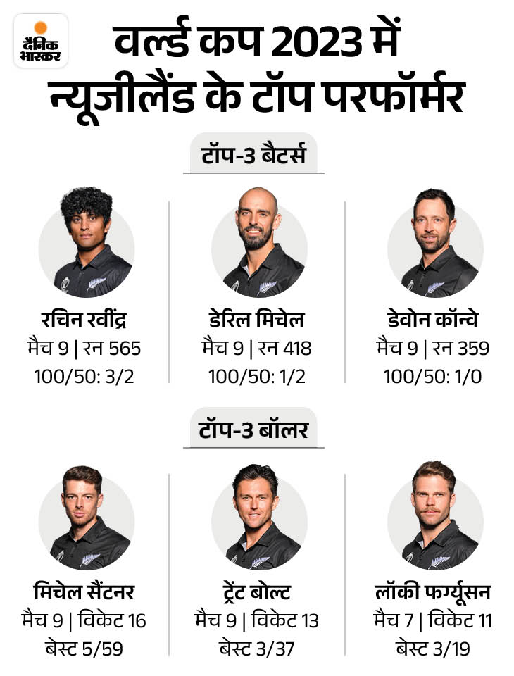न्यूजीलैंड दौरे पर अपना पहला विश्व कप खेल रहे रचिन रवींद्र ने अहम योगदान दिया. उन्होंने केन विलियमसन के स्थान पर टीम के शुरुआती मैच खेले और शतक बनाकर शुरुआती एकादश में अपनी जगह पक्की की। रचिन ने टूर्नामेंट में 3 शतक और 2 अर्धशतक लगाकर 565 रन बनाए हैं, वह सबसे ज्यादा रन बनाने वाले बल्लेबाज भी हैं। डेरिल मिशेल और डेवोन कॉनवे टीम के शेष 2 शीर्ष स्कोरर हैं।