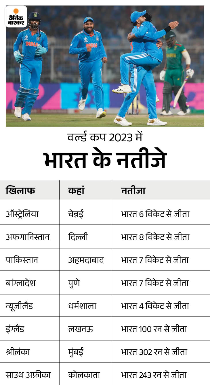 पहला मैच जीतने के बाद टीम इंडिया ने दबदबा बनाना शुरू किया और अफगानिस्तान, पाकिस्तान, बांग्लादेश, न्यूजीलैंड, इंग्लैंड, श्रीलंका और दक्षिण अफ्रीका पर एकतरफा जीत दर्ज की. टीम इंडिया लगातार 7 मैच जीतकर सेमीफाइनल में पहुंची. टीम इंडिया ने अब तक 8 मैच जीते हैं. उनका आखिरी मैच 12 नवंबर को बेंगलुरु में नीदरलैंड्स के खिलाफ होगा।