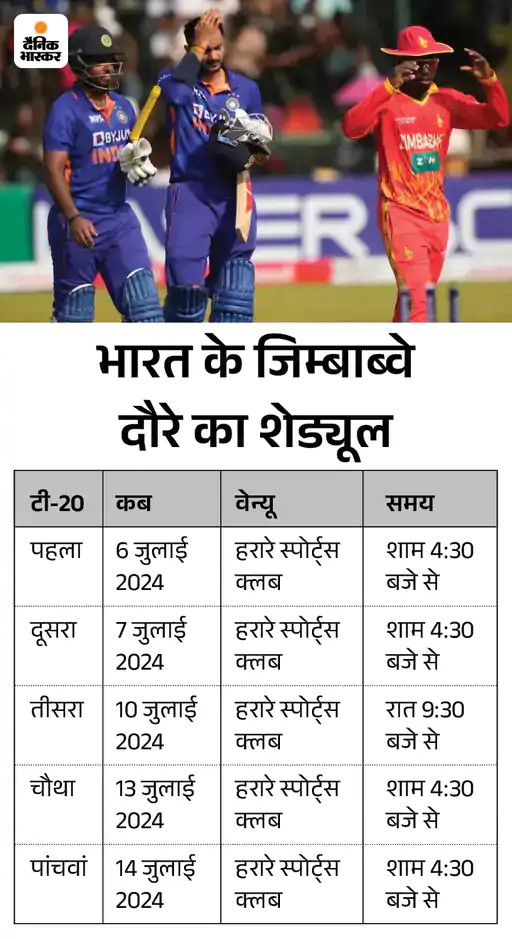 भारतीय टीम का जिम्बाब्वे का आखिरी दौरा 2022 में था। इस दौरान टीम ने 3 वनडे मैचों की सीरीज खेली थी। टीम ने तीनों गेम जीतकर सीरीज 3-0 से अपने नाम कर ली। भारत ने जिम्बाब्वे के खिलाफ आखिरी टी-20 सीरीज 2016 में खेली थी, जहां टीम इंडिया ने 2-1 से जीत हासिल की थी.