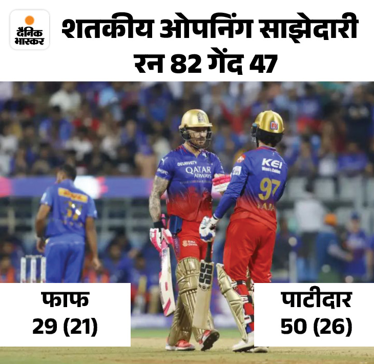 23 रन पर दो विकेट खोने के बाद कप्तान फाफ डु प्लेसिस ने रजत पाटीदार के साथ मिलकर टीम का स्कोर 100 रन के पार पहुंचाया. दोनों ने अर्धशतक लगाए. लेकिन मध्यक्रम में दिनेश कार्तिक के अलावा कोई और बल्लेबाज योगदान नहीं दे सका.