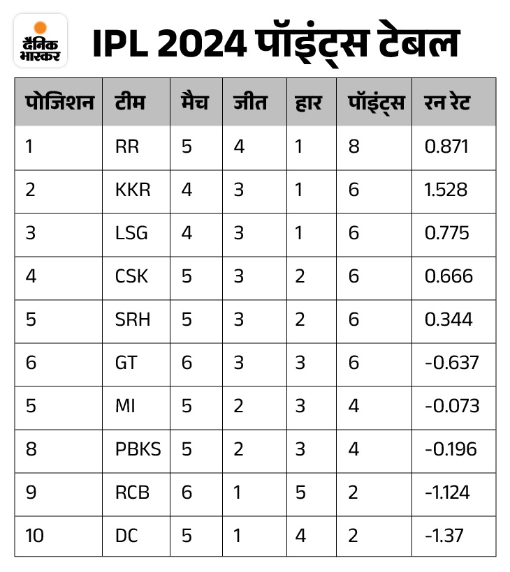 25वें मैच के बाद मुंबई की टीम मौजूदा सीजन की अंकतालिका में 7वें स्थान पर पहुंच गई, जबकि बेंगलुरु एक स्थान के नुकसान के साथ 9वें नंबर पर पहुंच गई। मुंबई ने 5 में से 2 मैच जीते और 4 अंक हासिल किए. टीम अपने पहले 3 गेम हार गई। दूसरी ओर, बेंगलुरु ने हर 6 मैचों में से एक में जीत हासिल की है। बाकी 5 गेम हारकर. बेंगलुरु के खाते में अभी तक केवल 2 अंक हैं।