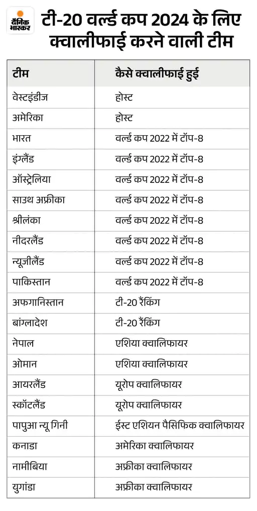 युगांडा की जीत के साथ ही टी20 वर्ल्ड कप में हिस्सा लेने वाली 20 टीमों का फैसला हो गया है. इसके लिए एशियाई क्षेत्र से नेपाल और ओमान ने क्वालिफाई किया, जबकि अफ्रीका से युगांडा और नामीबिया ने विश्व कप का टिकट हासिल किया। वेस्टइंडीज और संयुक्त राज्य अमेरिका ने मेजबानी करके क्वालीफाई किया, जबकि इंग्लैंड, पाकिस्तान, न्यूजीलैंड, भारत, ऑस्ट्रेलिया, दक्षिण अफ्रीका, नीदरलैंड और श्रीलंका ने 2022 में आखिरी टी20 विश्व कप में शीर्ष 8 में रहकर अपना स्थान सुरक्षित किया। अफगानिस्तान और बांग्लादेश ने 14 नवंबर, 2022 की रैंकिंग के अनुसार क्वालीफाई कर लिया है।