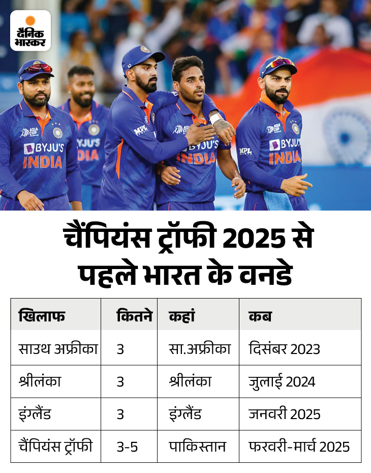हाल ही में भारत में वनडे वर्ल्ड कप ख़त्म हुआ. अब अगला आईसीसी टूर्नामेंट फरवरी-मार्च 2025 के दौरान चैंपियंस ट्रॉफी के रूप में आयोजित किया जाएगा। जिसके लिए 15 महीने से भी कम समय बचा है। चैंपियंस ट्रॉफी से पहले भारत सिर्फ 9 वनडे मैच खेलेगा. साउथ अफ्रीका में 3 वनडे के बाद टीम इंडिया श्रीलंका और इंग्लैंड के खिलाफ भी 3-3 वनडे मैच खेलेगी. फिर टीम सीधे आईसीसी टूर्नामेंट में प्रवेश करेगी. ऐसे में दक्षिण अफ्रीका का दौरा टीम में शामिल युवाओं के लिए भी अहम होगा.