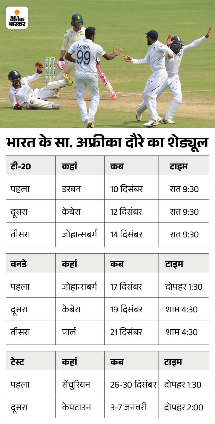 10 दिसंबर से शुरू होने वाले इस दौरे में भारतीय टीम को 3 टी-20 मैच, 3 वनडे और 2 टेस्ट मैचों की सीरीज खेलनी है. इस दौरे के लिए टीम 6 दिसंबर को रवाना होगी. अनुभवी बल्लेबाज विराट कोहली को दौरे की टी20 और वनडे सीरीज के लिए आराम दिया गया है. उन्होंने खुद ही इन दोनों सीरीज से ब्रेक मांगा था.