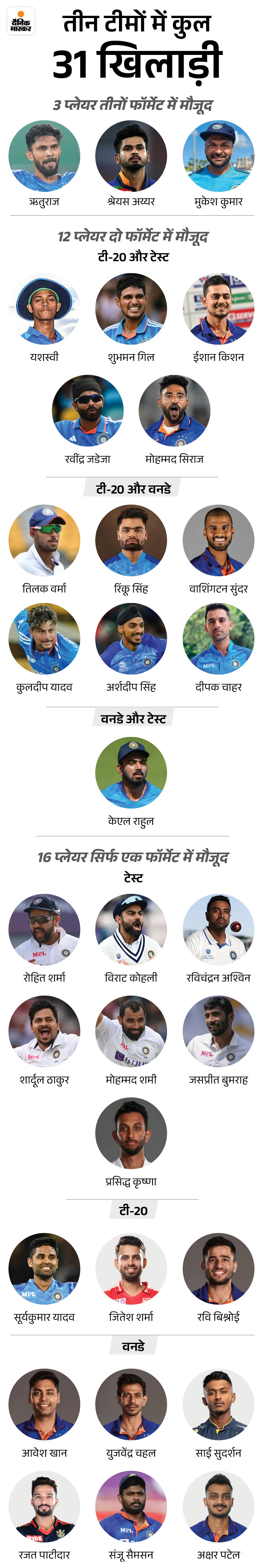 टेस्ट टीम: रोहित शर्मा (कप्तान)शुबमन गिल, यशस्वी जयसवाल, विराट कोहली, श्रेयस अय्यर, रुतुराज गायकवाड़, इशान किशन (विकेटकीपर), केएल राहुल (विकेटकीपर), रविचंद्रन अश्विन, रवींद्र जड़ेजा, शार्दुल ठाकुर, मोहम्मद सिराज, मुकेश कुमार, मोहम्मद शमी, जसप्रित बुमरा (उप कप्तान) ) और प्रसिद्ध कृष्ण।