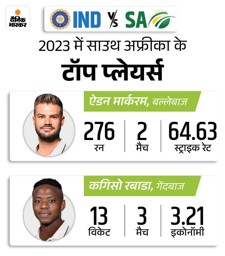 टेम्बा बावुमा दक्षिण अफ्रीका के प्रभारी हैं. साल 2023 में एडेन मार्कराम टीम के टॉप स्कोरर हैं, उन्होंने 276 रन बनाए. टॉप विकेट लेने वालों की लिस्ट में कगिसो रबाडा नंबर वन हैं, उन्होंने 3 टेस्ट मैचों में 13 विकेट लिए हैं।