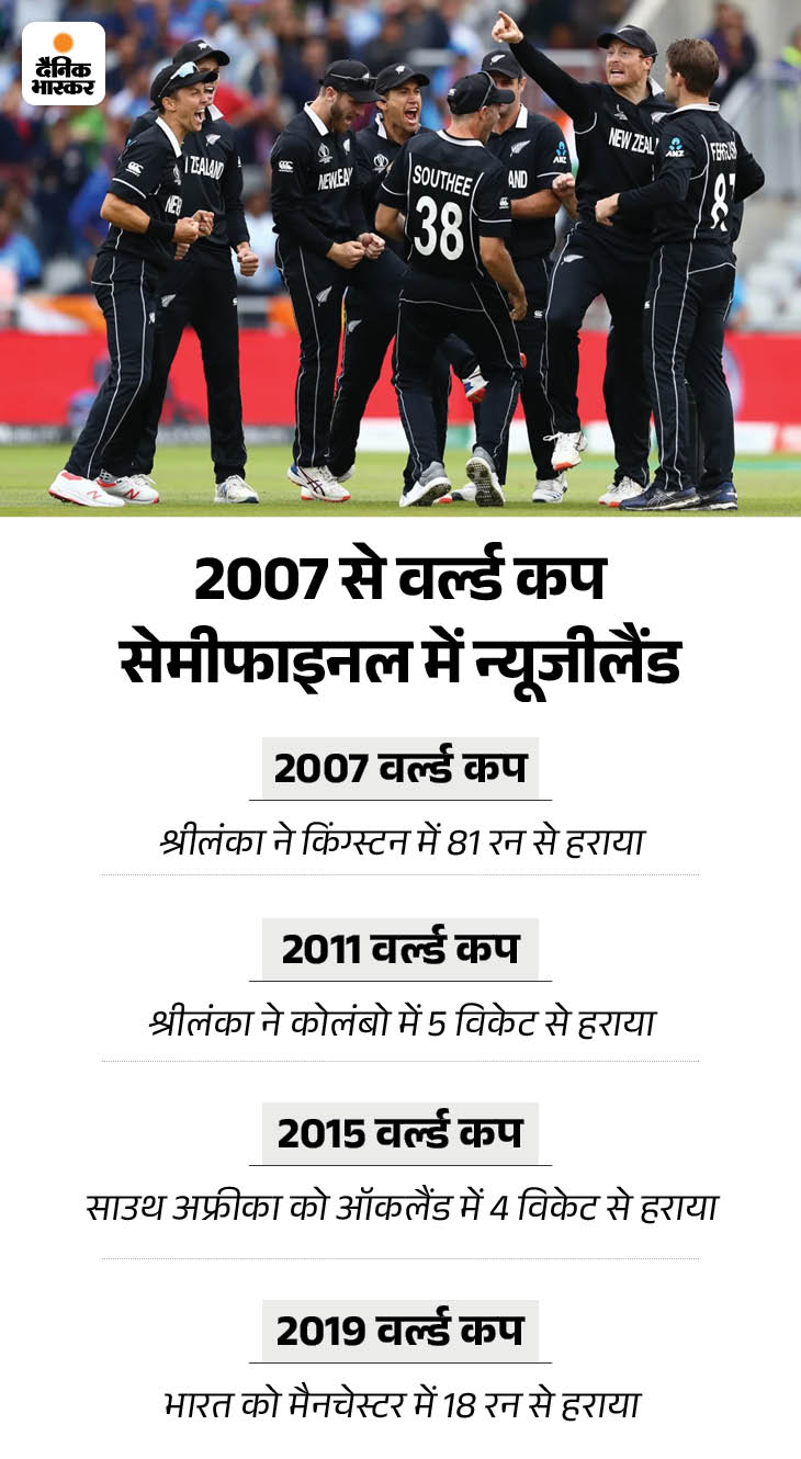 न्यूजीलैंड की टीम लगातार पांचवीं बार वनडे विश्व कप सेमीफाइनल में खेलेगी। 2007 और 2011 की शुरुआत में टीम को सेमीफाइनल में श्रीलंका से हार मिली थी, जबकि 2015 और 2019 में भी टीम फाइनल में पहुंची थी। दोनों ही मौकों पर उन्हें मेजबान टीमों से हार का सामना करना पड़ा। 2015 में ऑस्ट्रेलिया और 2019 में इंग्लैंड ने खिताब जीता था।