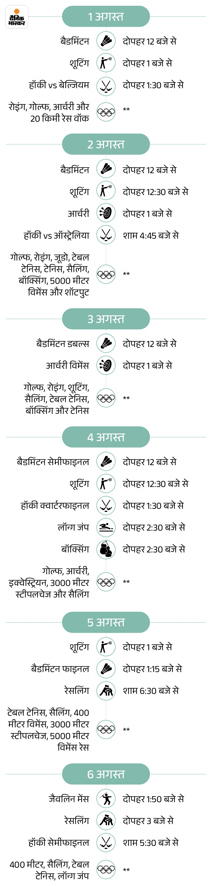 उद्घाटन समारोह 26 जुलाई को है, इसलिए उस दिन कोई कार्यक्रम नहीं होगा. पदक स्पर्धाएं 27 जुलाई से शुरू होंगी। इस दिन कुछ साइकिलिंग, गोताखोरी, तैराकी, तलवारबाजी, जूडो, रग्बी, शूटिंग और स्केटबोर्डिंग स्पर्धाओं के लिए पदक तय किए जाएंगे।