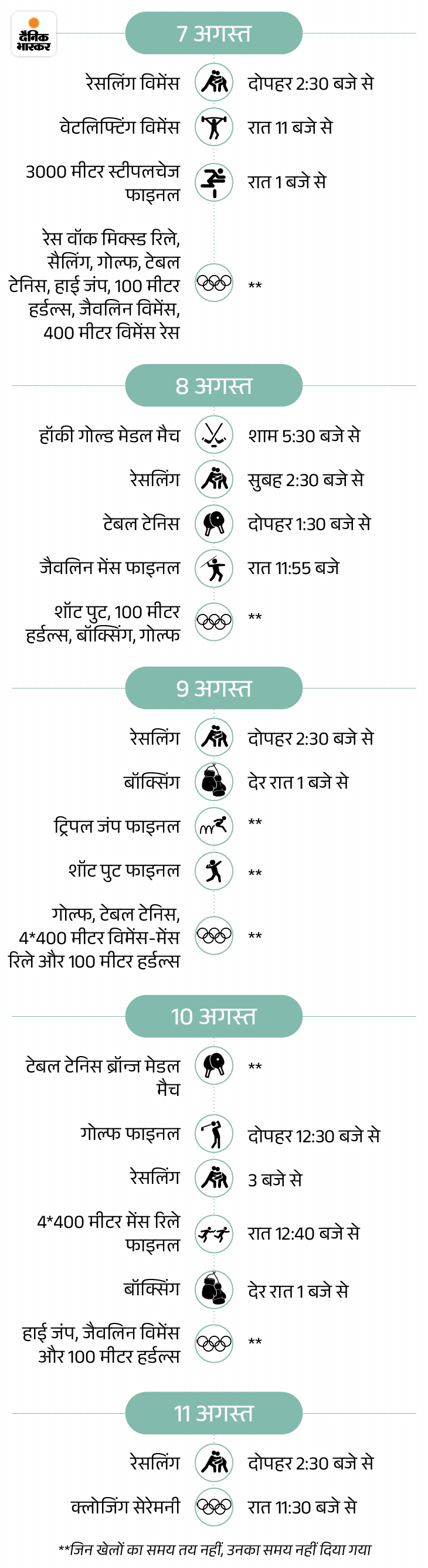 32 खेलों में 329 स्वर्ण पदक दांव पर होंगे. जिनमें से 39 का फैसला गोल्ड क्लोजिंग सेरेमनी से एक दिन पहले यानी 10 अगस्त को होगा. पहला शूटिंग मेडल इवेंट 27 जुलाई को मिश्रित एयर राइफल टीम इवेंट में आयोजित किया जाएगा। महिला बास्केटबॉल स्पर्धा का स्वर्ण पदक मैच 11 अगस्त को शाम 7 बजे होगा। इसके साथ ही ओलंपिक खेलों का समापन हो जाएगा. बाद में रात 11:30 बजे समापन समारोह होगा।