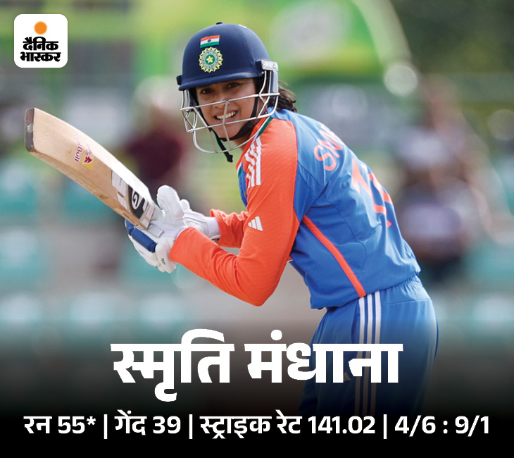 स्मृति मंधाना ने ओपनिंग की और टीम को जीत दिलाकर लौटीं. उन्होंने 39 गेंदों पर 55 रनों की नाबाद पारी खेली. स्मृति की पारी में एक छक्का और नौ चौके शामिल रहे. उन्होंने 141.02 की स्ट्राइक रेट से रन बनाए.