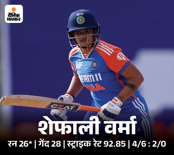 शेफाली ने 28 गेंदों पर 26 रन बनाए. उन्होंने 2 चौकों की मदद से 92.85 के स्ट्राइक रेट से रन बनाए। शेफाली ने मंधाना के साथ 66 गेंदों में 83 रन की साझेदारी निभाई.