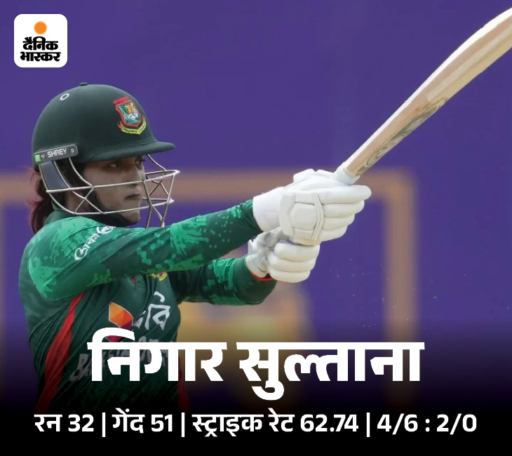 मैच में कैप्टन निगार सुल्ताना फाइटर रहीं। वह चौथे नंबर पर बल्लेबाजी करने आए और आखिरी ओवर तक बल्लेबाजी की. निगार ने बांग्लादेश टीम को बाहर होने से बचाया. उन्होंने 51 गेंदों पर 32 रन बनाए. उनकी पारी में 2 चौके शामिल रहे.
