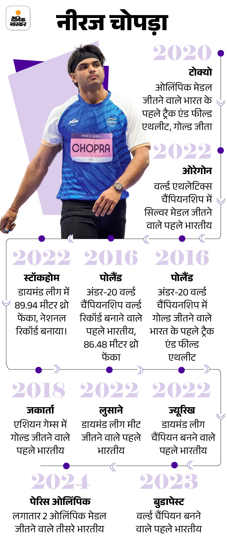 जूनियर और सीनियर सर्किट में बेहतरीन प्रदर्शन के बाद नीरज ने टोक्यो ओलंपिक के लिए क्वालिफाई कर लिया. पहले ओलंपिक खेलों में उन्होंने 87.58 मीटर भाला फेंककर स्वर्ण पदक जीता। उन्होंने 2022 विश्व फाइनल में रजत पदक और 2023 में स्वर्ण पदक जीता। इस बीच, स्टॉकहोम डायमंड लीग में उन्होंने 89.94 मीटर थ्रो किया और राष्ट्रीय रिकॉर्ड बनाया, जो नीरज का व्यक्तिगत सर्वश्रेष्ठ भी था।