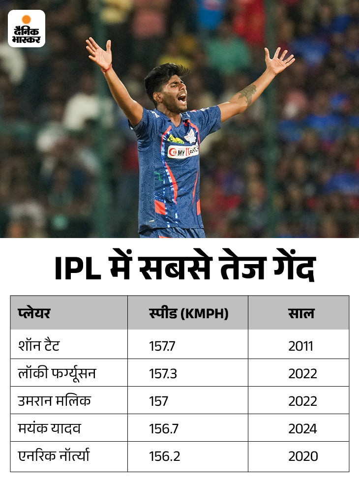 3. मयंक यादव ने सीजन की सबसे तेज गेंद फेंकी.
