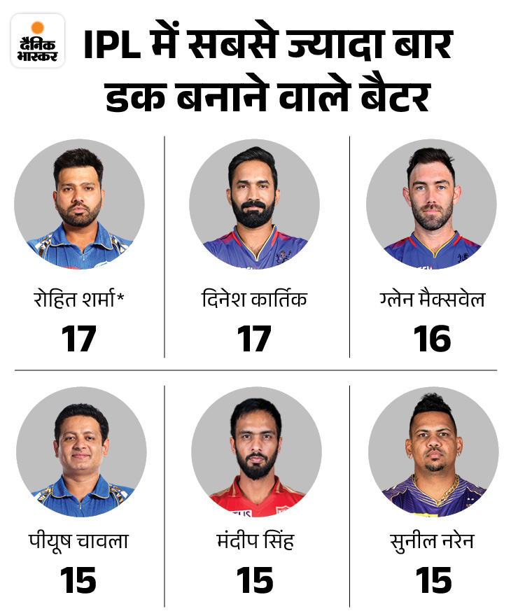 आरसीबी के ऑलराउंडर ग्लेन मैक्सवेल लखनऊ के खिलाफ अपना खाता भी नहीं खोल सके. उनका कैच मयंक यादव ने पकड़ा. मैक्सवेल अपने आईपीएल करियर में 16वीं बार शून्य यानी शून्य पर आउट हुए. जो कि विदेशी खिलाड़ियों में सबसे ज्यादा है, उन्होंने वेस्टइंडीज के सुनील नरेन का रिकॉर्ड तोड़ा, जिनके नाम 15 शून्य हैं। भारतीयों में रोहित शर्मा और दिनेश कार्तिक सबसे ज्यादा 17-17 बार चकमा दे चुके हैं।