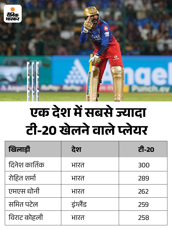 बेंगलुरु के विकेटकीपर दिनेश कार्तिक ने अपने करियर का 300वां टी20 भारत में खेला. वह एक ही देश में इतने सारे मैच खेलने वाले पहले खिलाड़ी बन गए। उनके बाद रोहित शर्मा ने भारत के लिए 289 मैच खेले हैं.