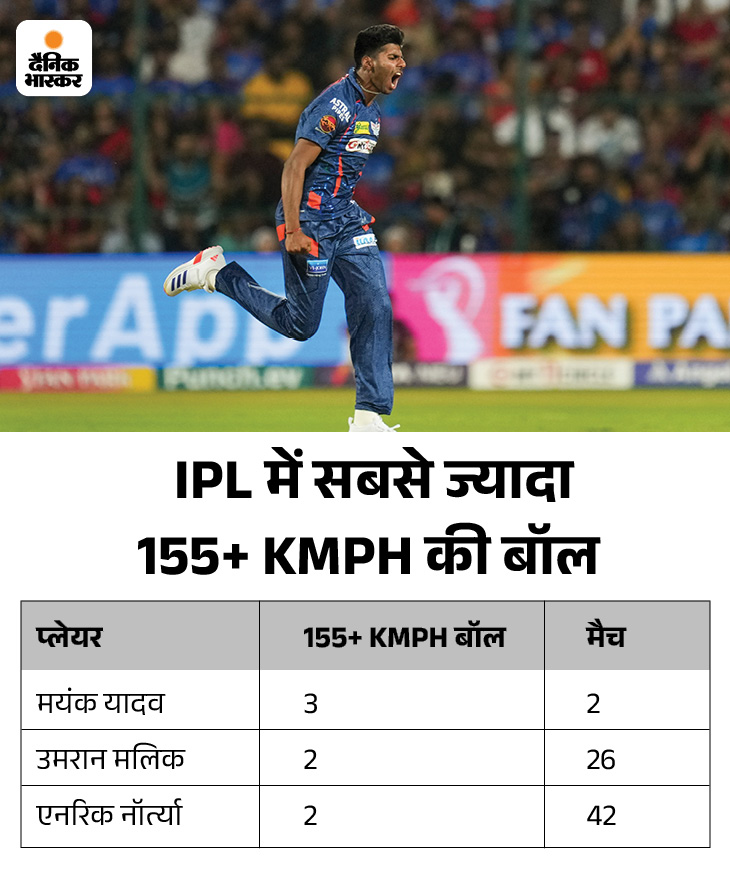 मयंक यादव ने बेंगलुरु के खिलाफ 155 किमी प्रति घंटे से ज्यादा की रफ्तार से 2 गेंदें फेंकी. साथ ही पहले गेम में उन्होंने 155 किमी/घंटा की रफ्तार से गेंद फेंकी थी. उन्होंने सिर्फ 2 मैचों में 155 KMPH से ज्यादा की रफ्तार से 3 गेंदें फेंकी हैं. टूर्नामेंट के इतिहास में किसी अन्य गेंदबाज ने उनसे ज्यादा 155 KMPH से ज्यादा गेंदें नहीं फेंकी हैं. उमरान मलिक और एनरिक नोर्ट्या ने ऐसा दो-दो बार किया है।
