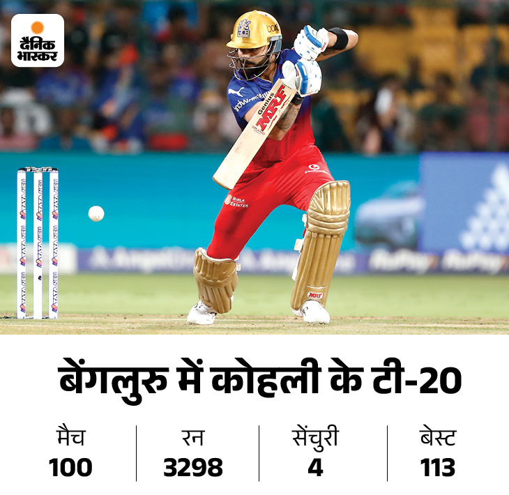 विराट कोहली ने बेंगलुरु के मैदान पर अपना 100वां टी20 खेला. वह एक ही विकेट पर 100 टी20 खेलने वाले पहले भारतीय बने। इन 100 मैचों में विराट ने एम चिन्नास्वामी स्टेडियम में 3298 रन बनाए हैं. इनमें 4 शतक शामिल हैं.