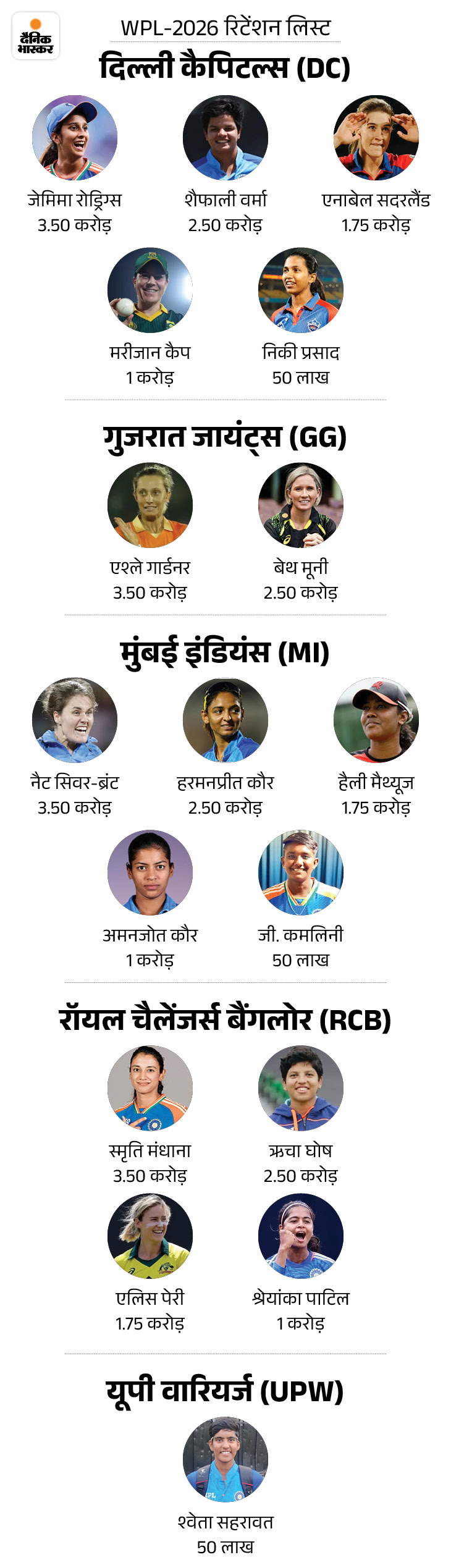 प्रतिधारण सूची 6 नवंबर को प्रकाशित हुई आगामी WPL सीज़न के लिए रिटेंशन लिस्ट 6 नवंबर को जारी की गई थी। इनमें कप्तान हरमनप्रीत कौर को मुंबई, स्मृति मंधाना को बेंगलुरु और जेमिमा रोड्रिग्ज को दिल्ली ने साइन किया था।