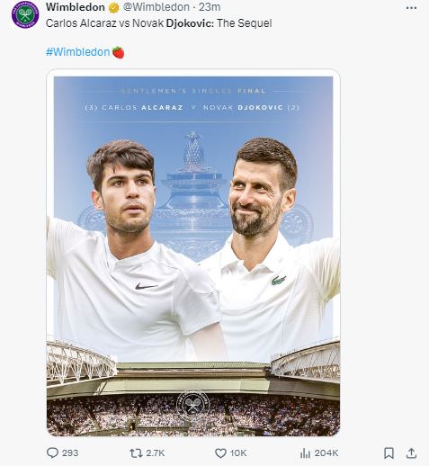 जोकोविच दसवीं बार विंबलडन फाइनल में पहुंचे। जोकोविच ओपन एरा में 24 ग्रैंड स्लैम जीतने वाले पहले खिलाड़ी हैं। इससे पहले, जोकोविच ने सर्वाधिक ग्रैंड स्लैम (पुरुष और महिला एकल) जीतने के मामले में सेरेना विलियम्स (23 ग्रैंड स्लैम) की बराबरी की थी। मार्गरेट कोर्ट ने भी कुल 24 ग्रैंड स्लैम जीते हैं, लेकिन इनमें से 13 खिताब ओपन एरा से पहले उनके नाम थे।