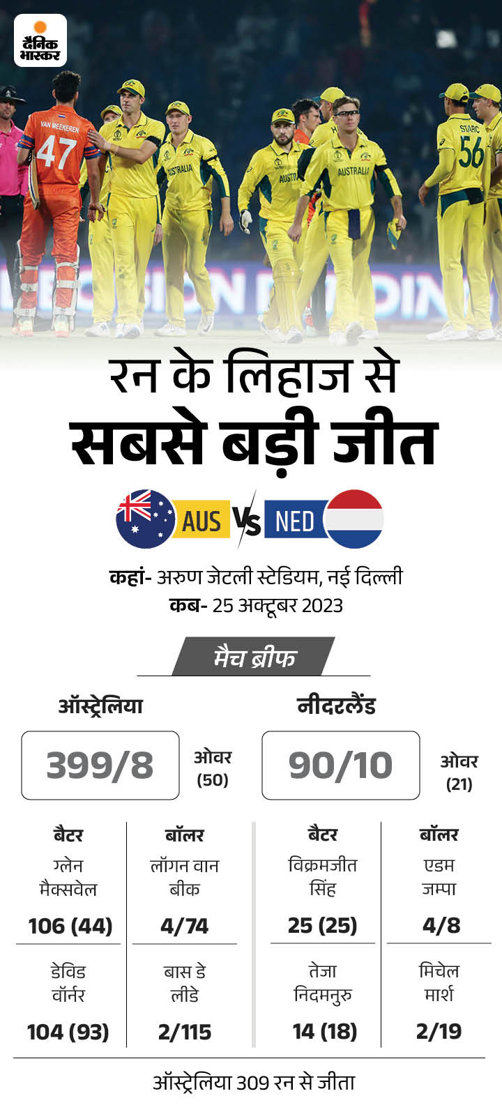 - पहला: रेसिंग के संदर्भ में इस विश्व कप में रनों के लिहाज से सबसे बड़ी जीत ऑस्ट्रेलिया के नाम रही. नई दिल्ली में कंगारू टीम ने नीदरलैंड्स को 309 रनों के अंतर से हरा दिया।