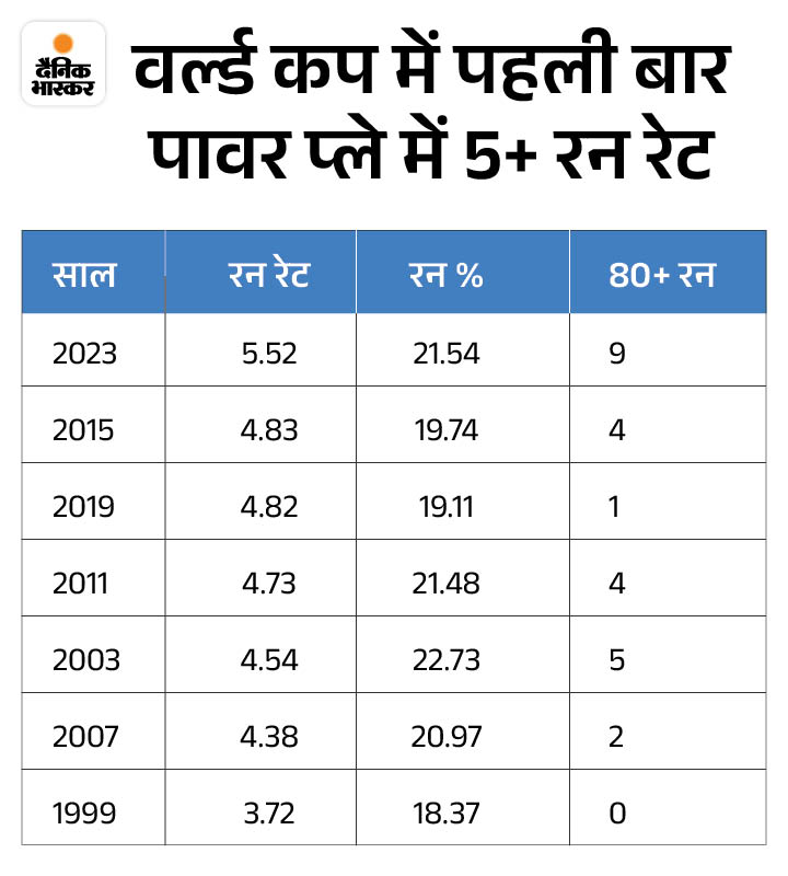वर्ल्ड कप 2023 के पावरप्ले में 5.52 की रेट से रन बने. जो अब तक वर्ल्ड कप के इतिहास में सबसे ज्यादा है. इस बार 9 मैचों के पावर प्ले में 80 या उससे ज्यादा रन बने. टूर्नामेंट के 21.54 प्रतिशत रन पावरप्ले से आए। टीम इंडिया ने पहले 10 ओवर में 6.97 की रन रेट से रन बनाए, जो टूर्नामेंट में सबसे तेज था.