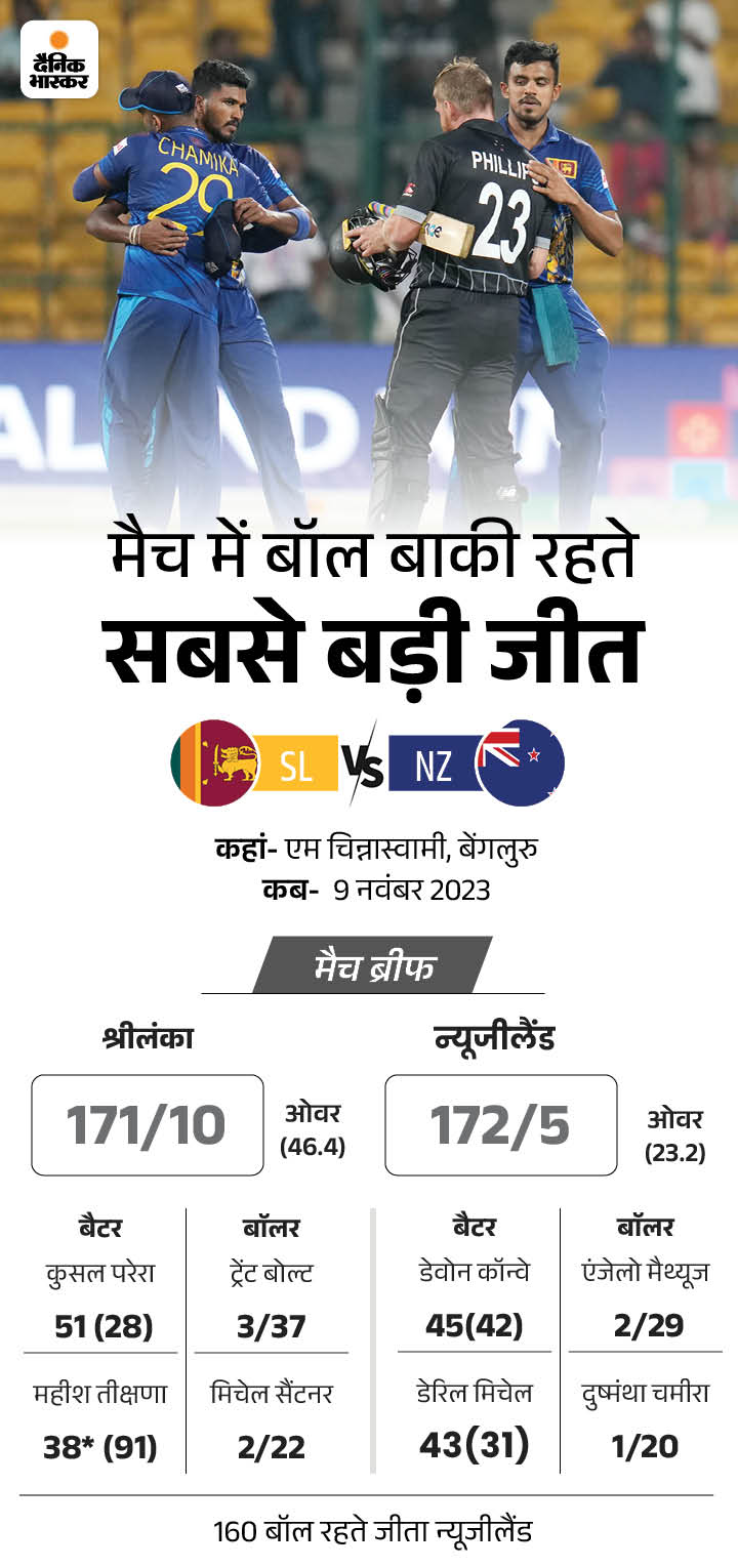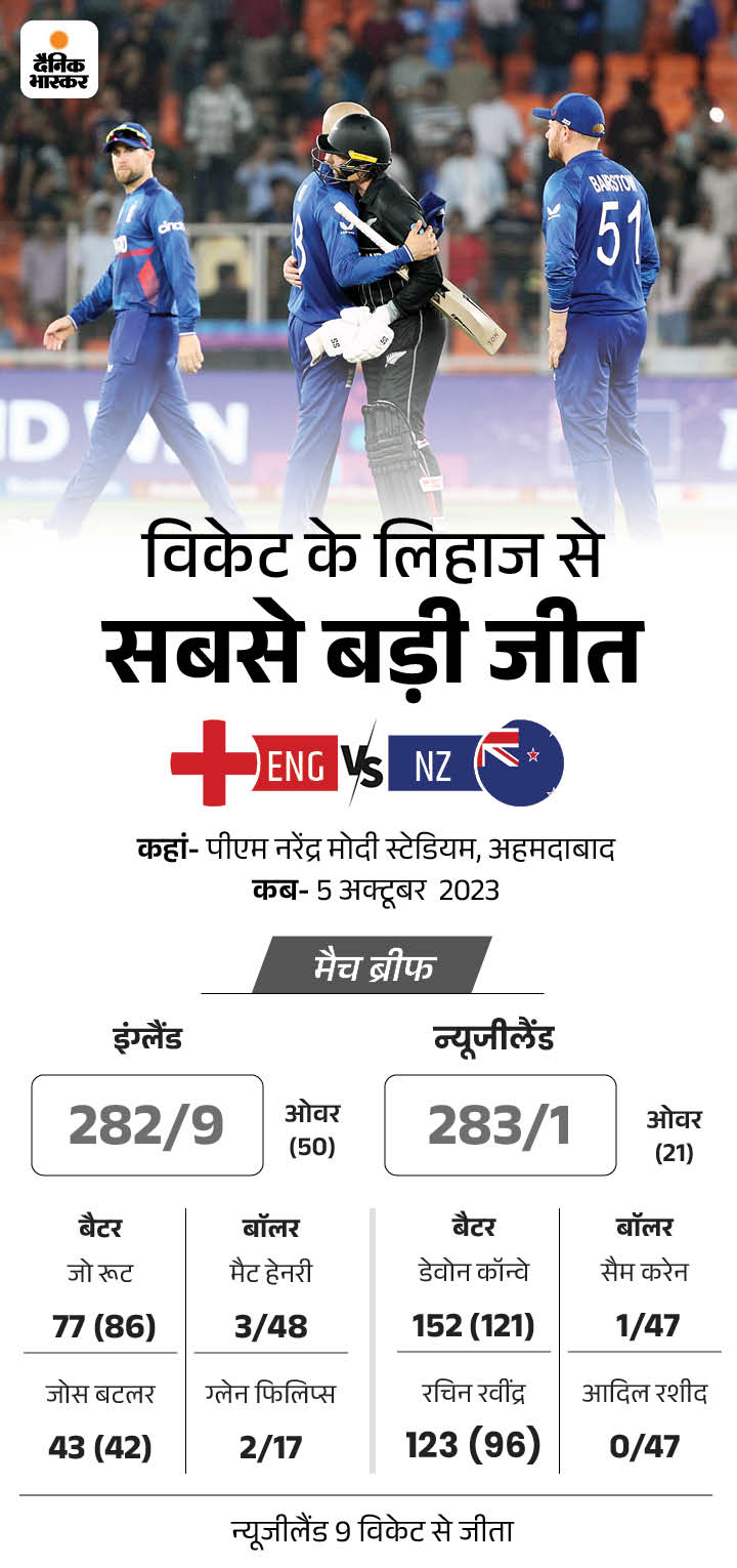 - दूसरा: विकेट के मामले में. मौजूदा वर्ल्ड कप में विकेटों के लिहाज से सबसे बड़ी जीत हासिल करने का ताज न्यूजीलैंड को मिला. न्यूजीलैंड की टीम ने 5 अक्टूबर को अहमदाबाद में इंग्लैंड को 9 विकेट से हरा दिया.