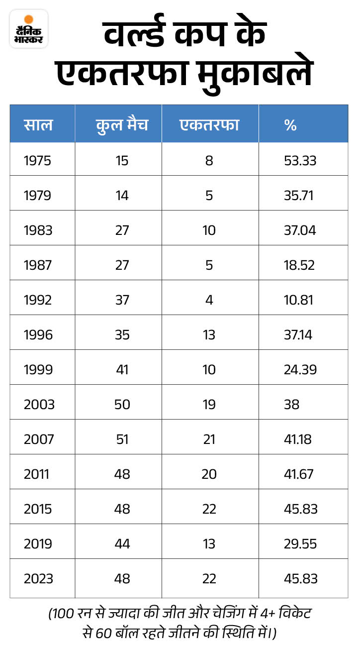 2023 विश्व कप ड्रॉ जीतो और मैच जीतो के दर्शन के खिलाफ गया। इस बार, 48 में से 29 गेम ड्रॉ हारने वाली टीमों ने जीते। इसका मतलब है कि 60.4% खेल ड्रॉ हारने वाली टीमों ने जीते। 1975 का विश्व कप भी इस मामले में सबसे आगे है. तब 14 में से 9 मैच यानी 64% मैच ड्रॉ हारने वाली टीमों ने जीते थे।