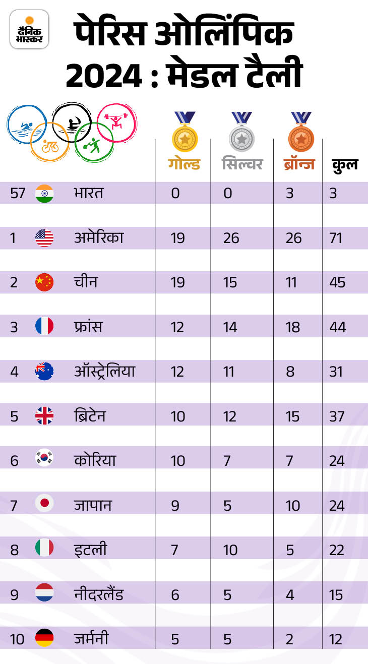ओलंपिक पदक तालिका में अमेरिकी टीम 19 स्वर्ण, 26 रजत और 26 कांस्य पदक जीतकर नंबर एक पर है. चीन दूसरे और फ्रांस तीसरे स्थान पर है.