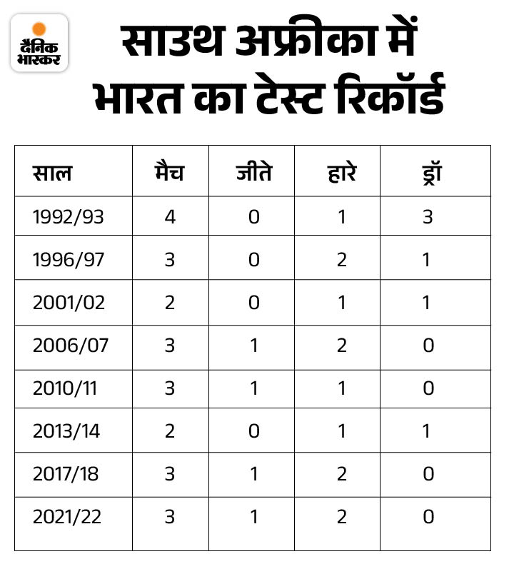 दक्षिण अफ्रीका में भारतीय टीम का प्रदर्शन कुछ खास नहीं रहा है. टीम इंडिया अब तक साउथ अफ्रीका में टेस्ट सीरीज जीतने में नाकाम रही है. टीम ने अब तक अफ्रीकी धरती पर 8 टेस्ट सीरीज खेली हैं। इनमें से एक ड्रॉ रही, जबकि 7 सीरीज में भारतीय टीम को हार का सामना करना पड़ा.