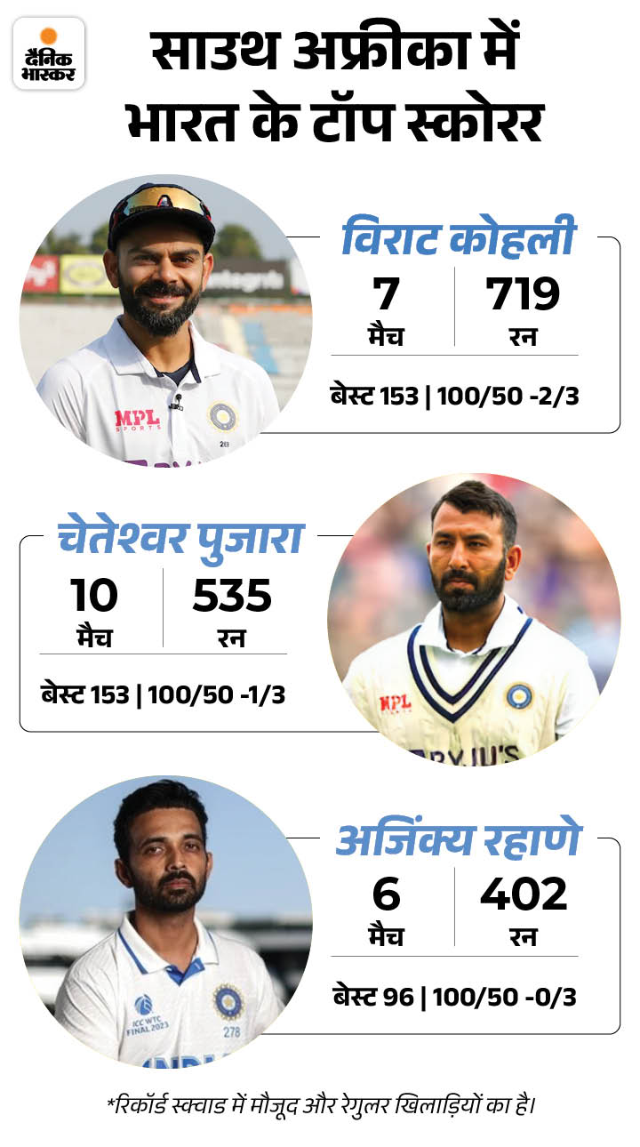 - चेतेश्वर पुजारा: 500 से ज्यादा रन बना चुके हैं भारत के अनुभवी टेस्ट बल्लेबाज चेतेश्वर पुजारा भी दक्षिण अफ्रीका दौरे पर धमाल मचा सकते हैं. उन्होंने दक्षिण अफ्रीकी मैदानों पर खेले गए 10 टेस्ट मैचों में 535 रन बनाए हैं। वहीं पुजारा ने एक शतक और साढ़े तीन शतक लगाए हैं.