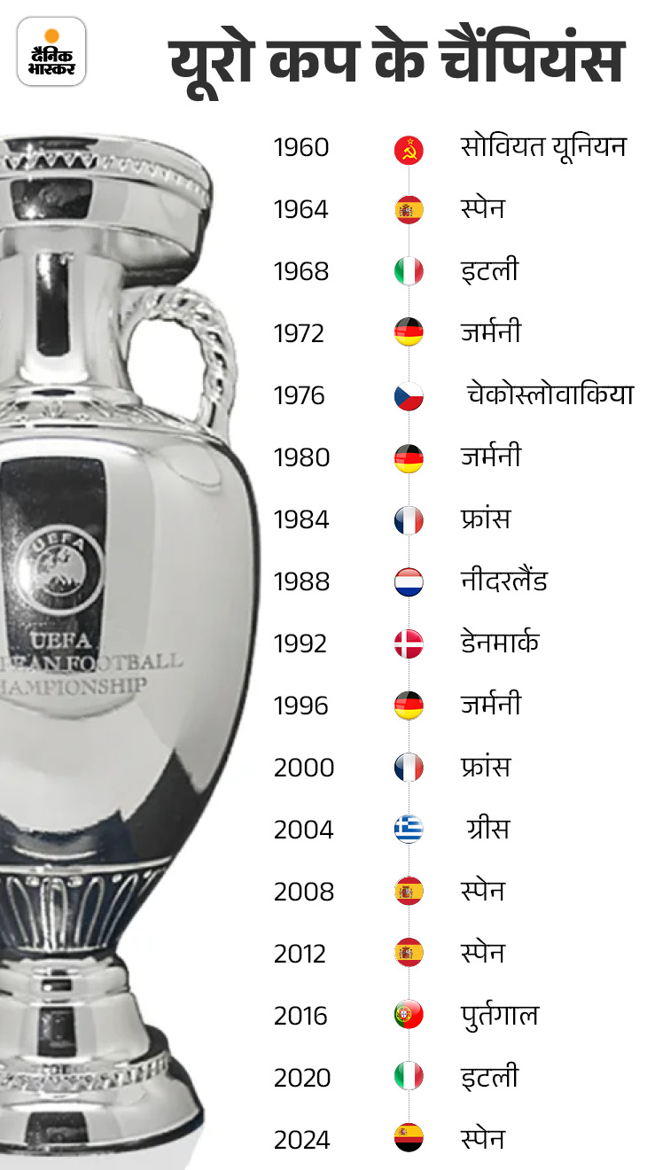स्पेन चार खिताबों के साथ यूरो कप की सबसे सफल टीम बन गई है. इसके अलावा जर्मनी के पास 3 यूरो खिताब हैं. आखिरी बार जर्मनी ने यह टूर्नामेंट 1996 में जीता था।