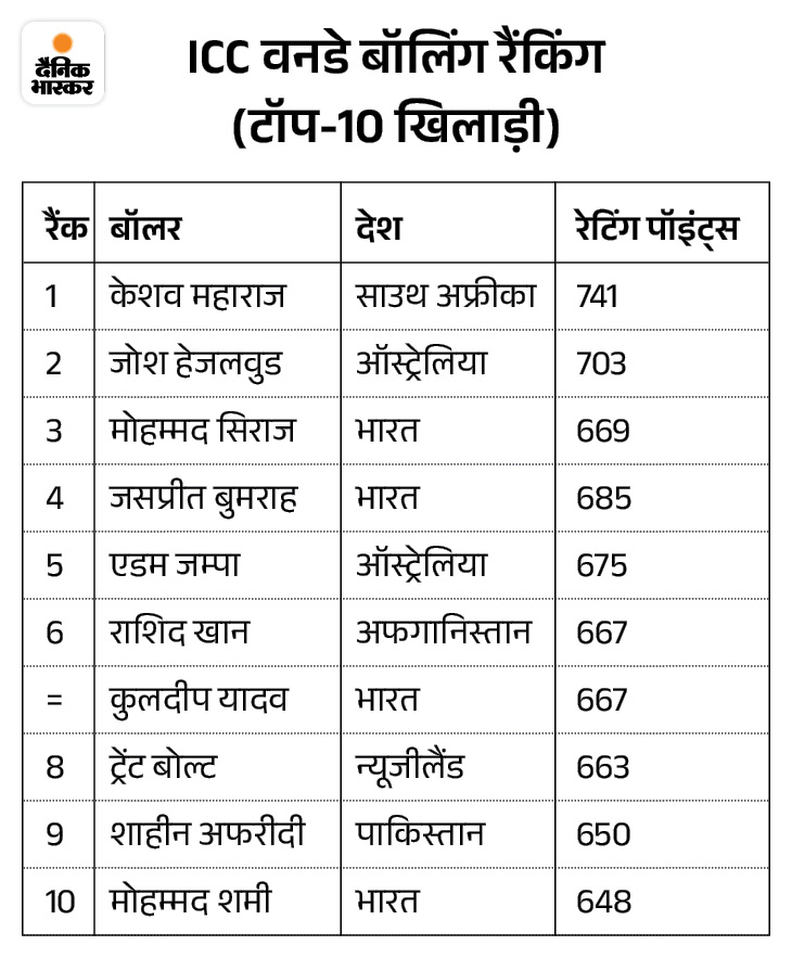 गेंदबाजी रैंकिंग में दक्षिण अफ्रीका के केशव महाराज शीर्ष पर बने हुए हैं, जबकि भारत के मोहम्मद सिराज एक स्थान नीचे खिसक गये हैं. वह दूसरे से तीसरे स्थान पर पहुंच गये हैं. आस्ट्रेलियाई जोश हेजलवुड दूसरे स्थान पर रहे।