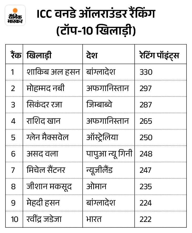 बांग्लादेश के कप्तान शाकिब अल हसन ओवरऑल रैंकिंग में सबसे आगे हैं। मोहम्मद नबी दूसरे और सिकंदर रजा तीसरे स्थान पर बने हुए हैं. राशिद खान भी यहीं हैं और वह चौथे स्थान पर हैं. टॉप 10 में शामिल जडेजा अकेले भारतीय हैं, उन्हें एक स्थान का नुकसान हुआ है और अब वह नौवें से दसवें नंबर पर आ गए हैं।