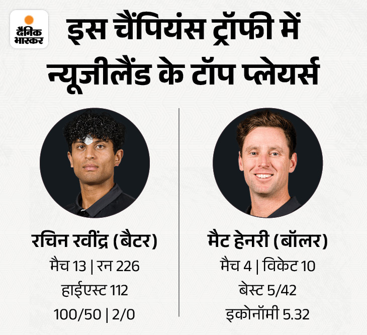 हेनरी टूर्नामेंट टॉप विक्ट रचिन रवींद्र इस टूर्नामेंट में न्यूजीलैंड के शीर्ष स्कोरर हैं। उन्होंने 3 मैचों में 226 दौड़ लगाई हैं। उन्होंने सेमीफाइनल में दक्षिण अफ्रीका के खिलाफ और बांग्लादेश के खिलाफ छठे मैच में एक सदी का स्कोर किया। द बॉलिंग एले मैट हेनरी टीम और टूर्नामेंट के सर्वश्रेष्ठ विकेटों को अभिनय कर रहे हैं। उन्होंने 4 मैचों में 10 विकेट लिए हैं।