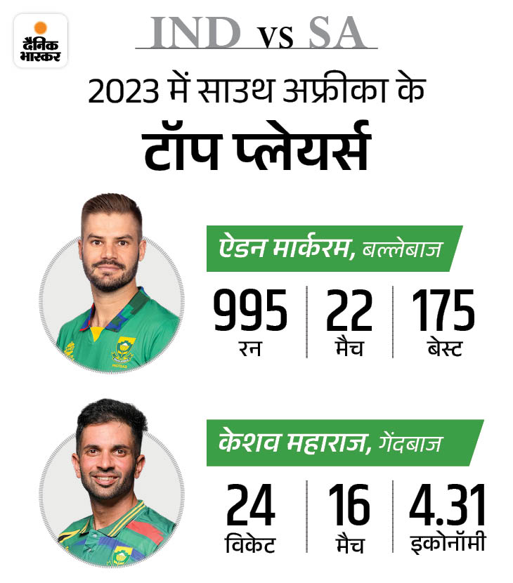 साउथ अफ्रीका की कमान एडेन मार्कराम के पास है. मार्कराम इस साल दक्षिण अफ्रीका के प्रमुख स्कोरर हैं। मार्कराम ने इस साल 22 मैचों में 995 रन बनाए हैं. टॉप विकेट लेने वालों की लिस्ट में केशव महाराज पहले नंबर पर हैं। इस साल उनके नाम 24 विकेट हैं.